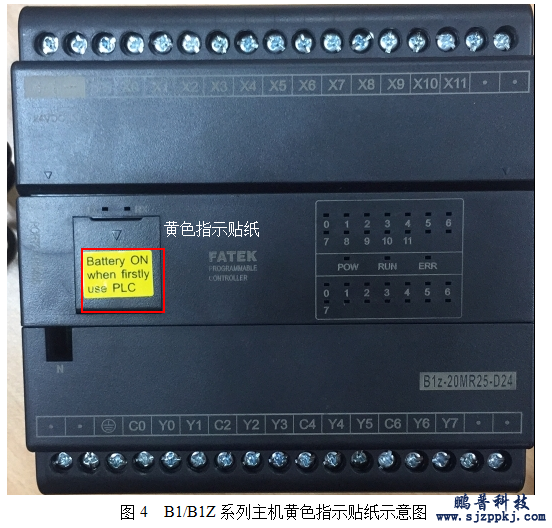 關于永宏PLC系列之FATEK FBs/B1/B1z PLC主機,如若在自帶通訊口PORT0的蓋板上貼有黃色指示貼紙的,便表示此主機存在記憶體電池撥開關。在使用之前,請務必將此撥碼開關撥到ON的位置,否則會導致程序、數據丟失等影響,耽誤您的設備運行。為了防止在運輸過程中,黃色指示貼紙掉落,請您在使用之前,檢查一下您手頭上的主機是否有撥碼開關,并且是否需要撥到ON的位置。